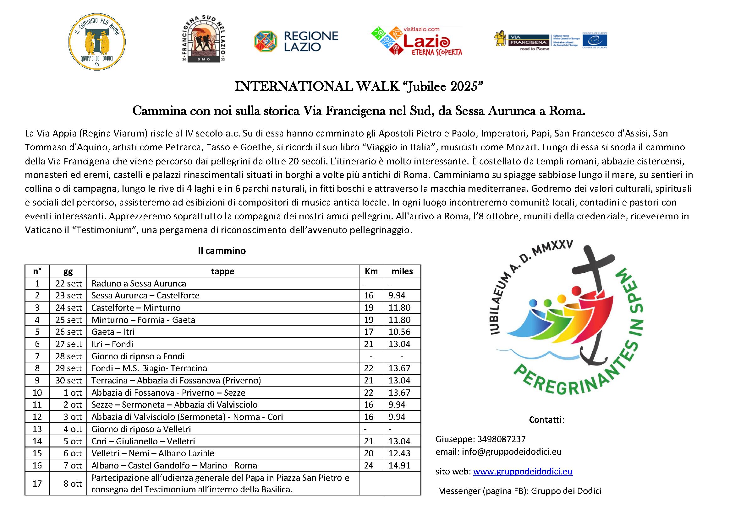 La camminata si snoda da Sessa Aurunca a Roma e prevede 15 tappe. L’edizione 2023 di questo evento è stato premiato ai CT Award 2024 nella categoria Connecting Cultures, Il premio, assegnato a Stoccarda, ha riconosciuto l'impegno della DMO Via Francigena Sud nel Lazio e dei volontari del Gruppo dei Dodici, che hanno realizzato un progetto significativo che valorizza il viaggio come esperienza e non solo.